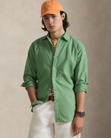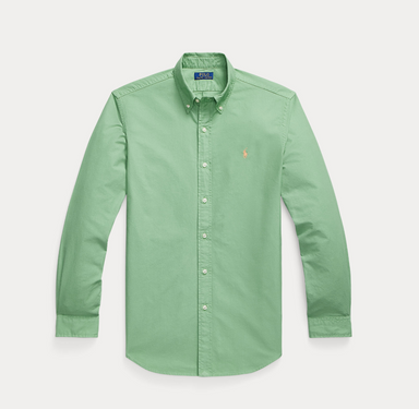 Fris groen oxford garment dyed hemd in regular fit met polospeler in het oranje.