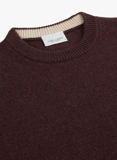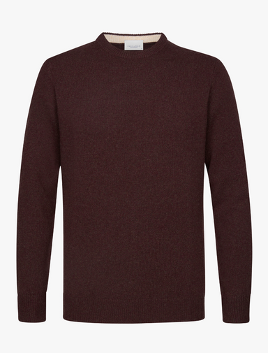 Trui met ronde hals in een kleurmix brie met hoofdkleur bordeaux. 80% wol 20% polyamide